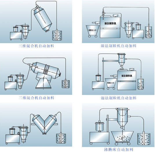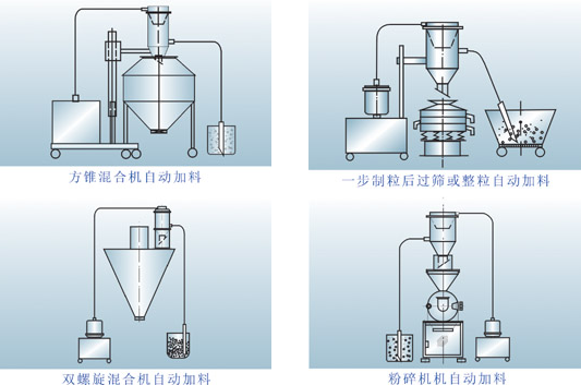 我公司生产的真空加料机是在广泛吸收国外同类产品的基础上开发研制的新产品,它是国内先进、理想、完善的粉状料、粒状料、粉粒料混合料的真空输送设备。真空加料机能自动地将各种物料输送到包装机、注塑机、粉碎机等设备的料斗中,也能直接把混合的物料输送到混合机(如V型混合机、二维混合机、三维混合机等)中,减轻了工人劳动强度,解决了加料时粉尘外溢等问题,是制药厂、食品厂通过GMP认证、促进清洁、文明生产的首选设备。